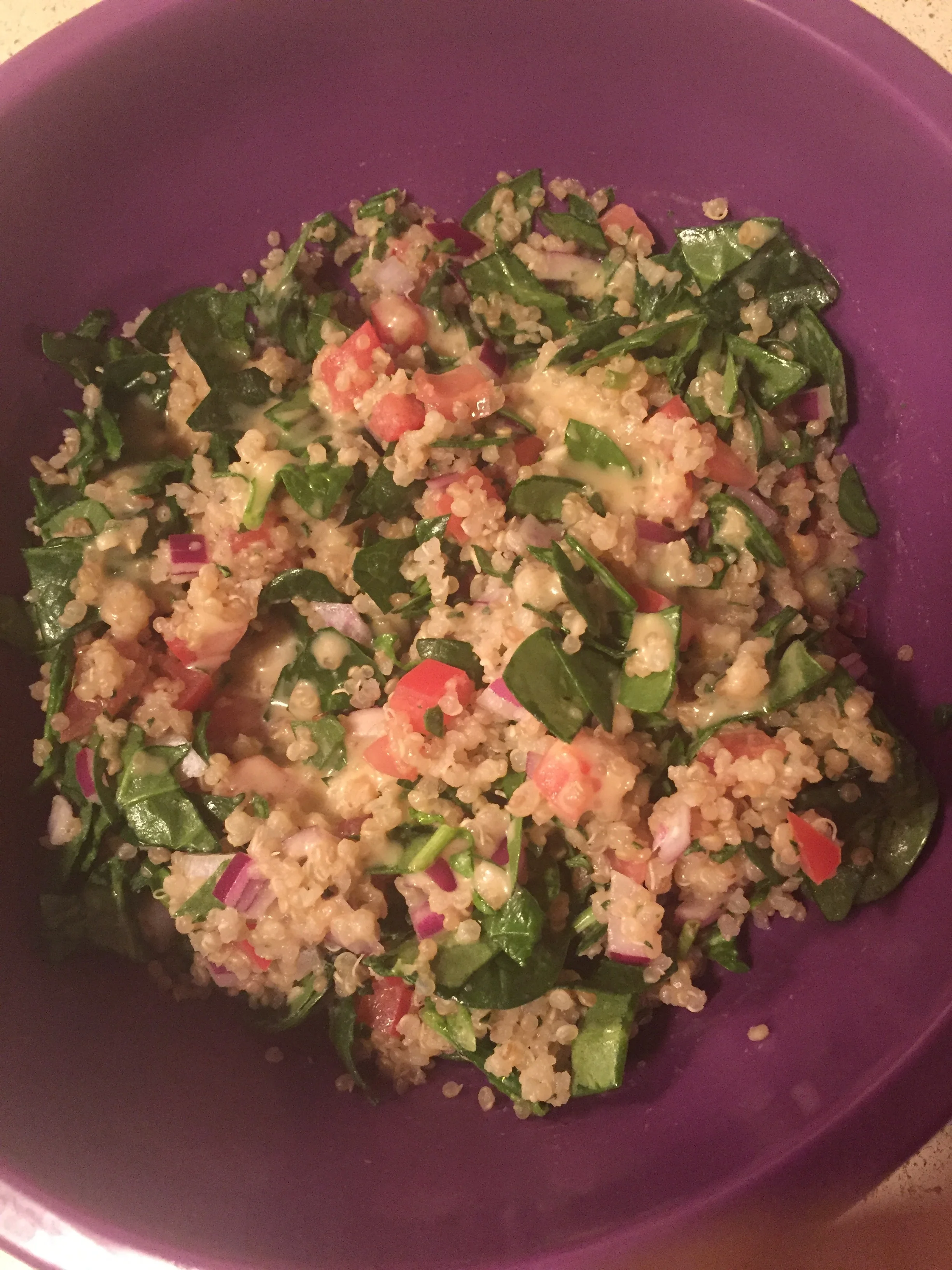 100% Vegan and full of flavor. This is our kale and quinoa power salad: tomatoes, black beans, cucumbers, red onion, dijon-honey vinaigrette. High protein, gluten free, and dairy free. Sin without the umm...